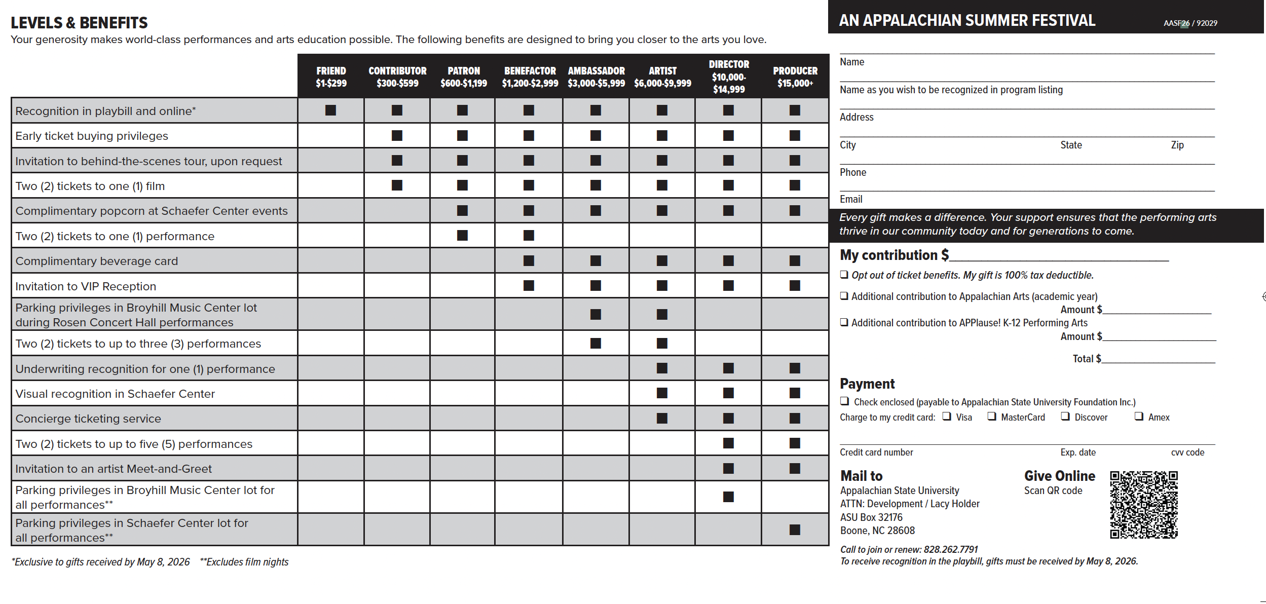 An Appalachian Summer Festival deeply appreciates the support of its contributors. This list reflects contributions and pledges made solely to the App Summer Annual Campaign from Oct. 1, 2024-May 12, 2025. Please note that this list does not include gifts to other areas within Appalachian State University.
